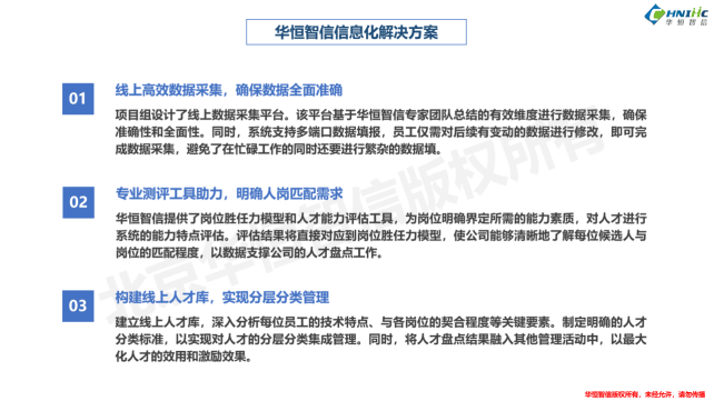 为此,华恒智信项目组建议该公司借助人才盘点系统,并实施以下策略:搭建线上数据采集平台,实现人才信息的全面、准确、高效收集;利用专业的测评工具,对人才进行系统的能力评估,明确岗位所需的核心能力素质,为公司的招聘和选拔提供有力依据;建立线上人才库,整理储存收集到的人才信息,并实现人才的分层分类管理,为不同类型的人才提供定制化的发展路径。