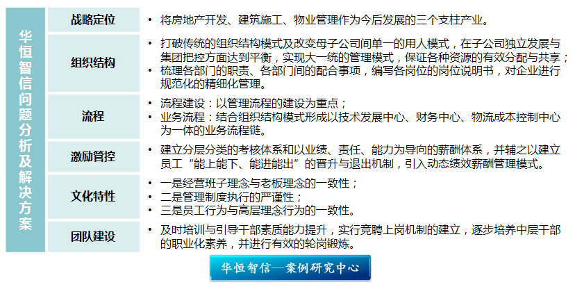 针对该集团企业的现状问题情况,结合建筑行业的优劣势及发展趋势,华恒智信顾问团队主要从战略/决策、组织/结构、流程/供应链、激励/管控、文化特性、团队建设六个维度来进行系统分析和对比,为企业的健康发展提供一些建议。