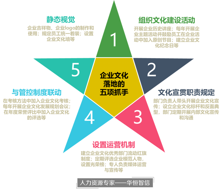 在设计工作顺利完成后,项目组协助该公司进行了企业文化落地实施方案的设计。经过对该供水公司的深入调研和对以往公司案例的分析和解读,华恒智信提出了五个抓手确保落地: