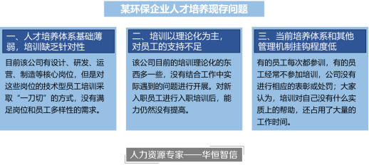 该公司在前期的发展中,没有意识到内部管理的重要性,对人才的管理也仅仅止步于以简单奖惩为主要手段的人事管理阶段,对人才缺乏培养、激励等管理机制,把人才当作“人力”进行管理。随着市场竞争的日益加剧与激烈,公司逐渐暴露出了一些人力资源管理问题。比如,员工能力不足,领导交办的工作往往没人能承担;工作效率低下,核心人才数量不够;员工参加培训的情况,没有相应的奖惩;培训内容脱离实际,导致员工在培训后能力没有提高,员工认为培训意义不大;核心人才觉得在公司没有能力提升空间,流失率有增加的趋势……对核心人才应该如何培养和管理等问题已经成为困扰公司领导的难题。对此,该公司管理者希望能借助外部专业机构的力量,制定合理的核心人才培养管理规划。凭借着丰富的咨询实践和同类型行业的研究经验,华恒智信在多家咨询公司中脱颖而出,成为该公司的咨询项目服务提供商。